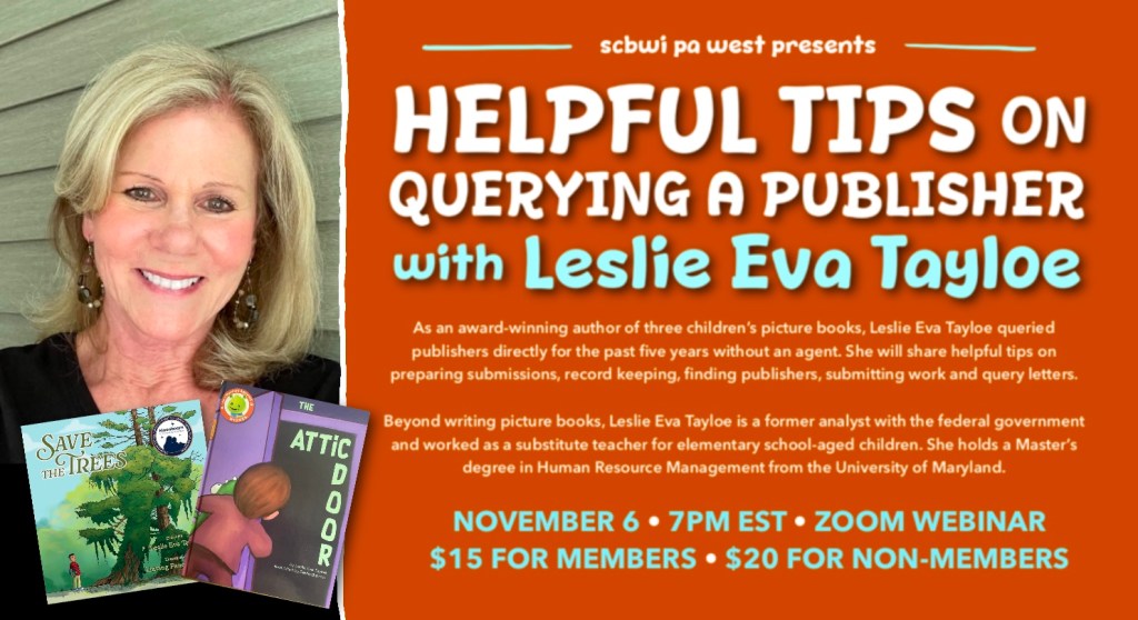 November 6, 2025, Speaker for SCBWI Pennsylvania West, Virtual, 7:00pm EST, Presentation includes: Preparing Submission: What a writer needs to do before submission; Record keeping: How to organize and track your submissions, Finding Publishers: Where to search, Submitting your work: Best practices, The query letter. https://www.scbwi.org/events/scbwi-pa-west-presents-helpful-tips-on-querying-a-publisher-with-leslie-eva-tayloe